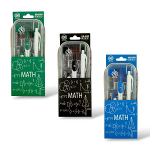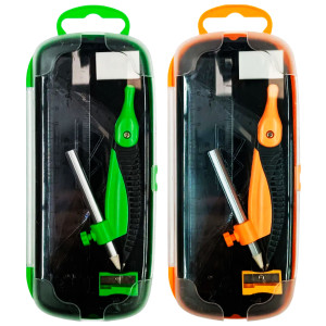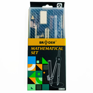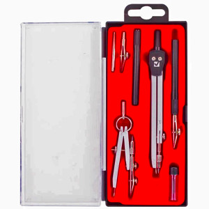 В набор входит: 1 циркуль, циркуль-измеритель, стиралка, точилка, карандаш, 4 линейки.
