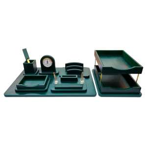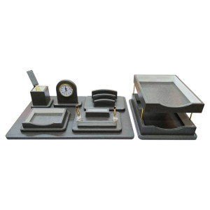 Очень легкий и прочный. В набор входит: тройной горизонтальный лоток для бумаг, подставка для писем, круглая подставка для ручек, круглая подставка для скрепок, квадратный лоток для записного блока....